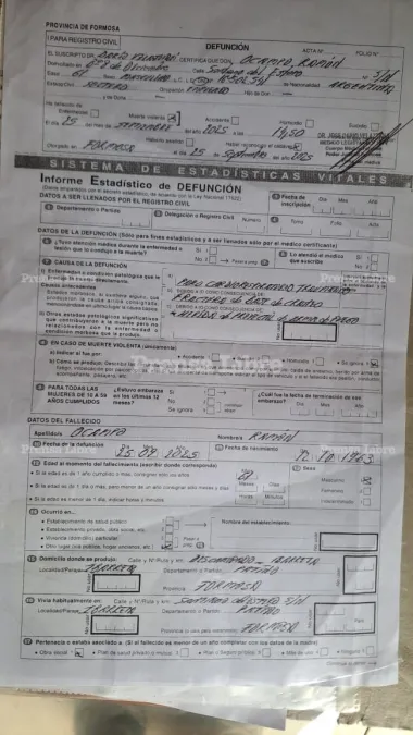 A las irregularidades denunciadas por su hija Zuny Ocampo, ahora se suma un hecho gravísimo: las hijas de Ramón acaban de retirar el acta de defunción del Registro Civil de Ibarreta, que certifica que Ocampo murió el 25 de septiembre a las 14:50 horas por "muerte violenta".