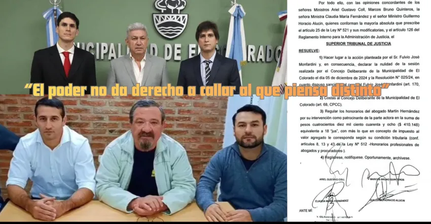 La decisión se dictó en el expediente "Monfardini, Fulvio José c/ H.C.D. de la Municipalidad de El Colorado s/ Conflicto de Poderes" (Expte. N° 124/2024), donde el máximo tribunal provincial dio la razón al edil opositor, quien había sido suspendido arbitrariamente en sus funciones y privado de sus haberes por orden del cuerpo deliberativo local.